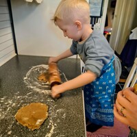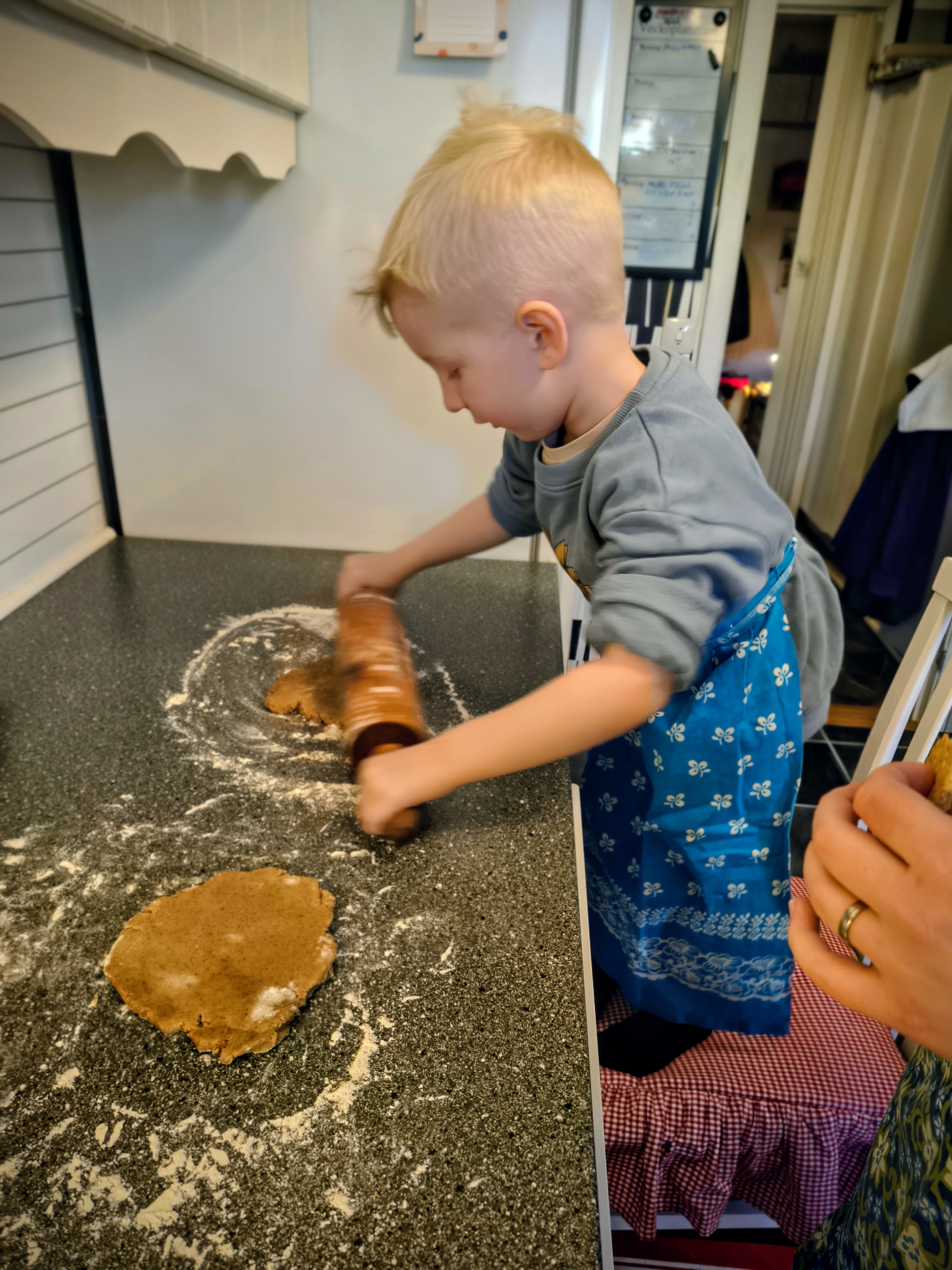 - sv Att baka pepparkakor är populärt vid den här tiden på året. Man kan göra egen deg eller köpa färdig. Roligt att gammelmormors nästan hundra år gamla kavel åter kommit till användning, den här gången körd av Elliot som också tyckte det var gott att äta av degen men det hör ju till.