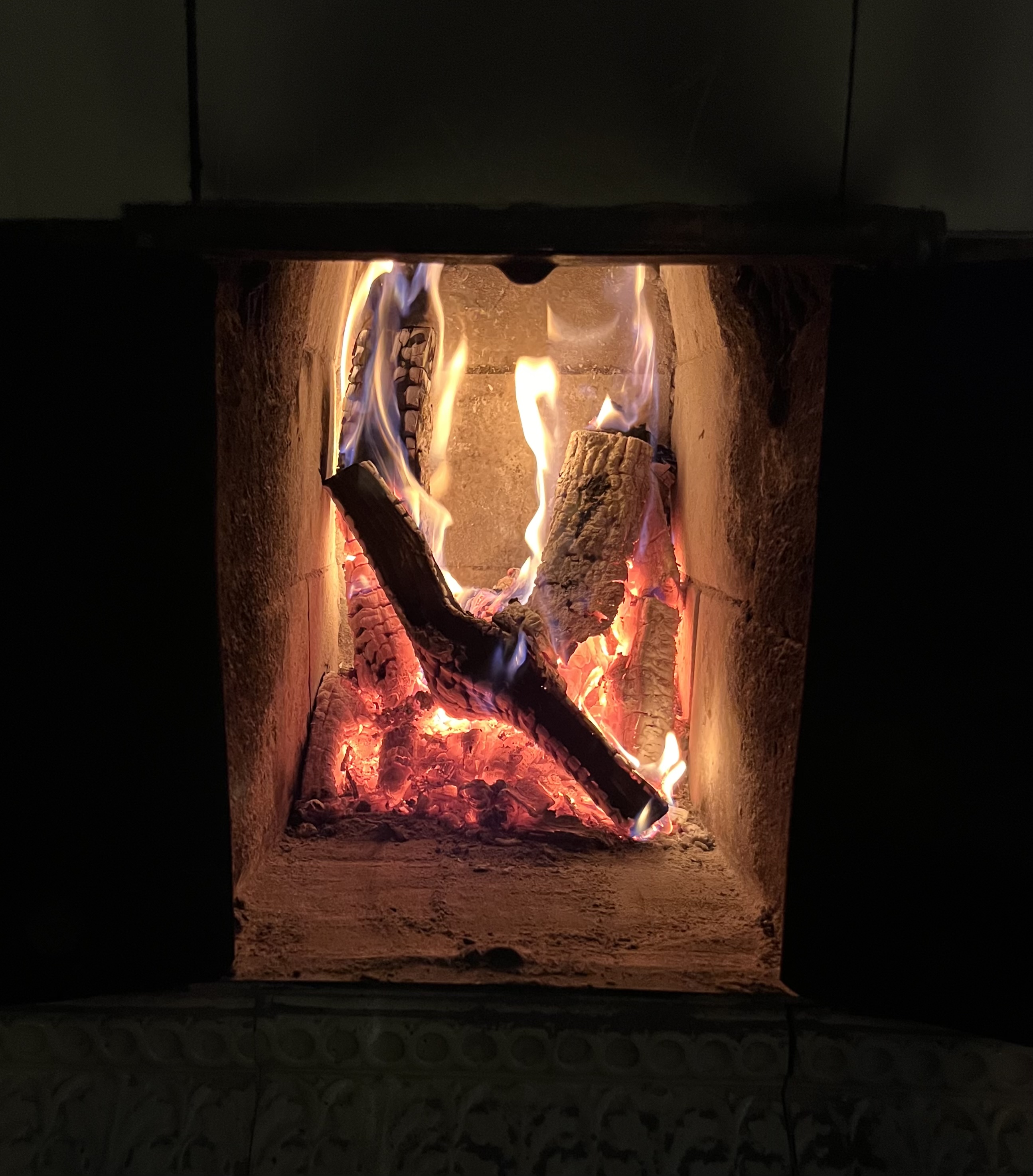 - sv I kakelugnen brinner ved av lönnen som förr stod på vår tomt. Värmen behövs när januarikylan smyger sig på. Med värme, mat och kärlek överlever vi vadsomhelst.