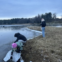 - sv En utflykt vid vattnet i Noret på Ljusterö, juldagen 2025. Barnen kastar macka med isflak.