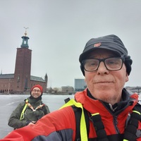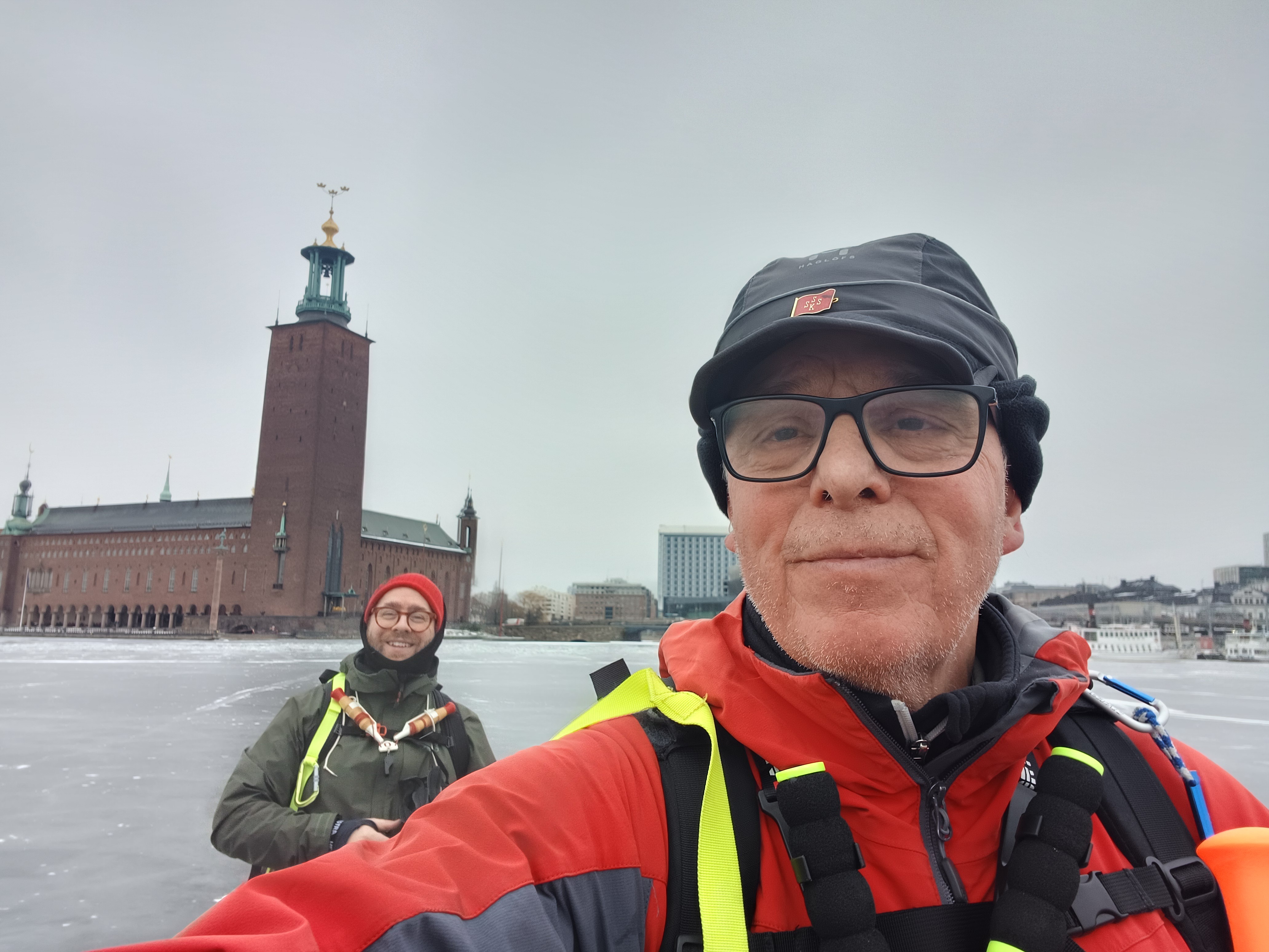 - sv Selfie med åkkompis i bakgrunden. En skridskoåjares dröm att glida fram på Riddarfjärden med Stadshuset som fond.
