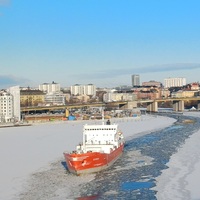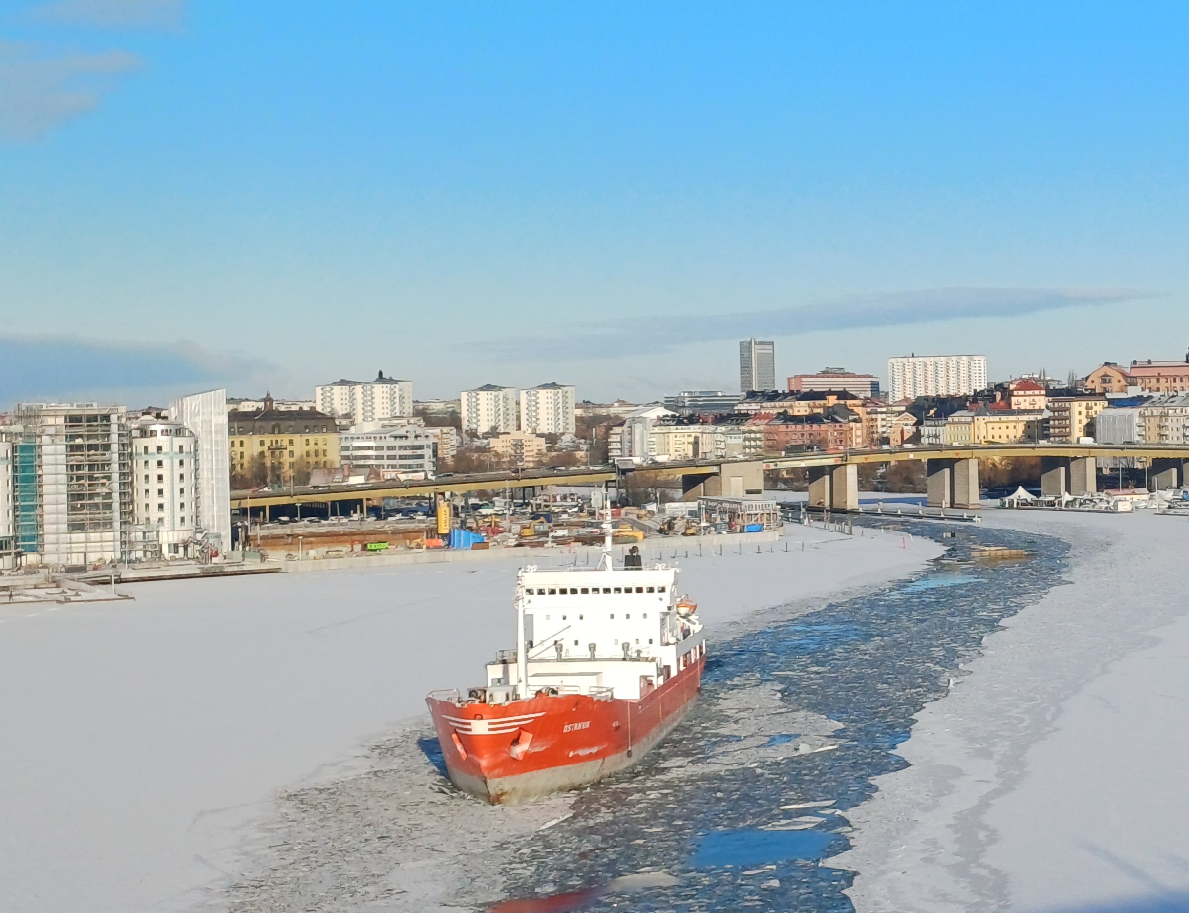 - sv Faryget Östanvik har just lämnat Lövholmskajen och passerat under Liljeholmsbron i isrännan på Årstaviken. Slutmålet är Slite på Gotland.