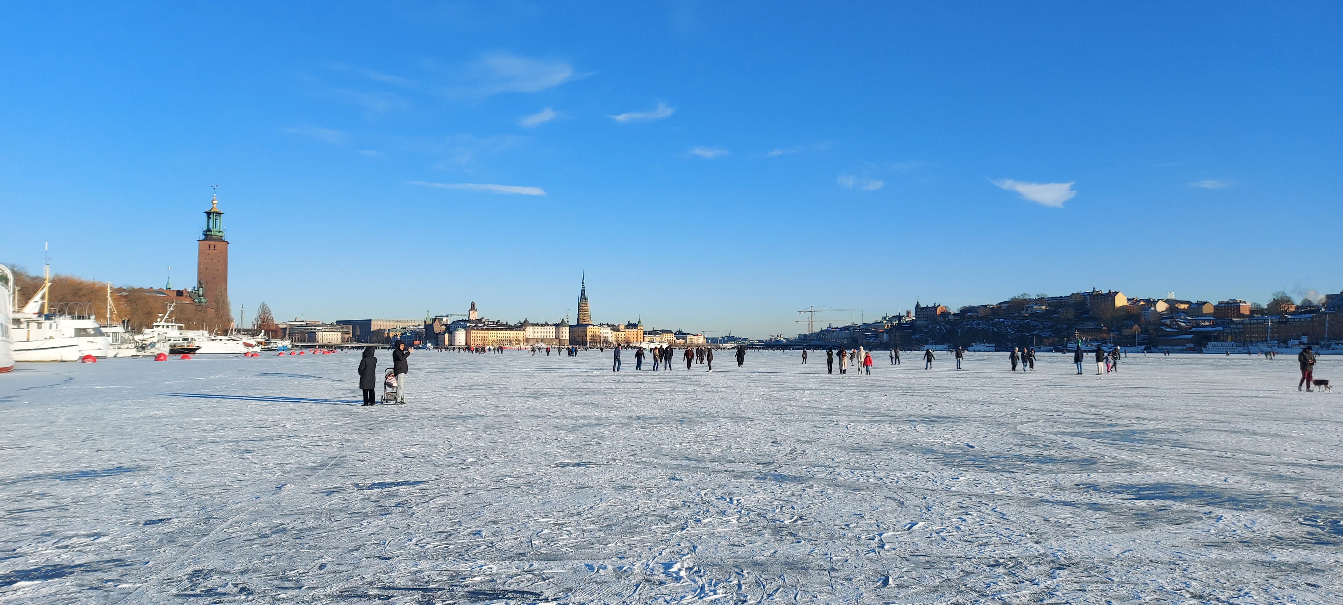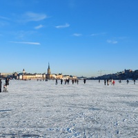 - sv Lördagspromenad på Riddarfjärden. Isen ligger, så många stockholmare och turister passar på att promenera och åka skridskor i solskenet den 14 februari 2026. Fin blank is under ett tunt puder av snö.
