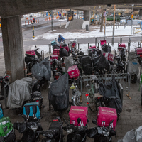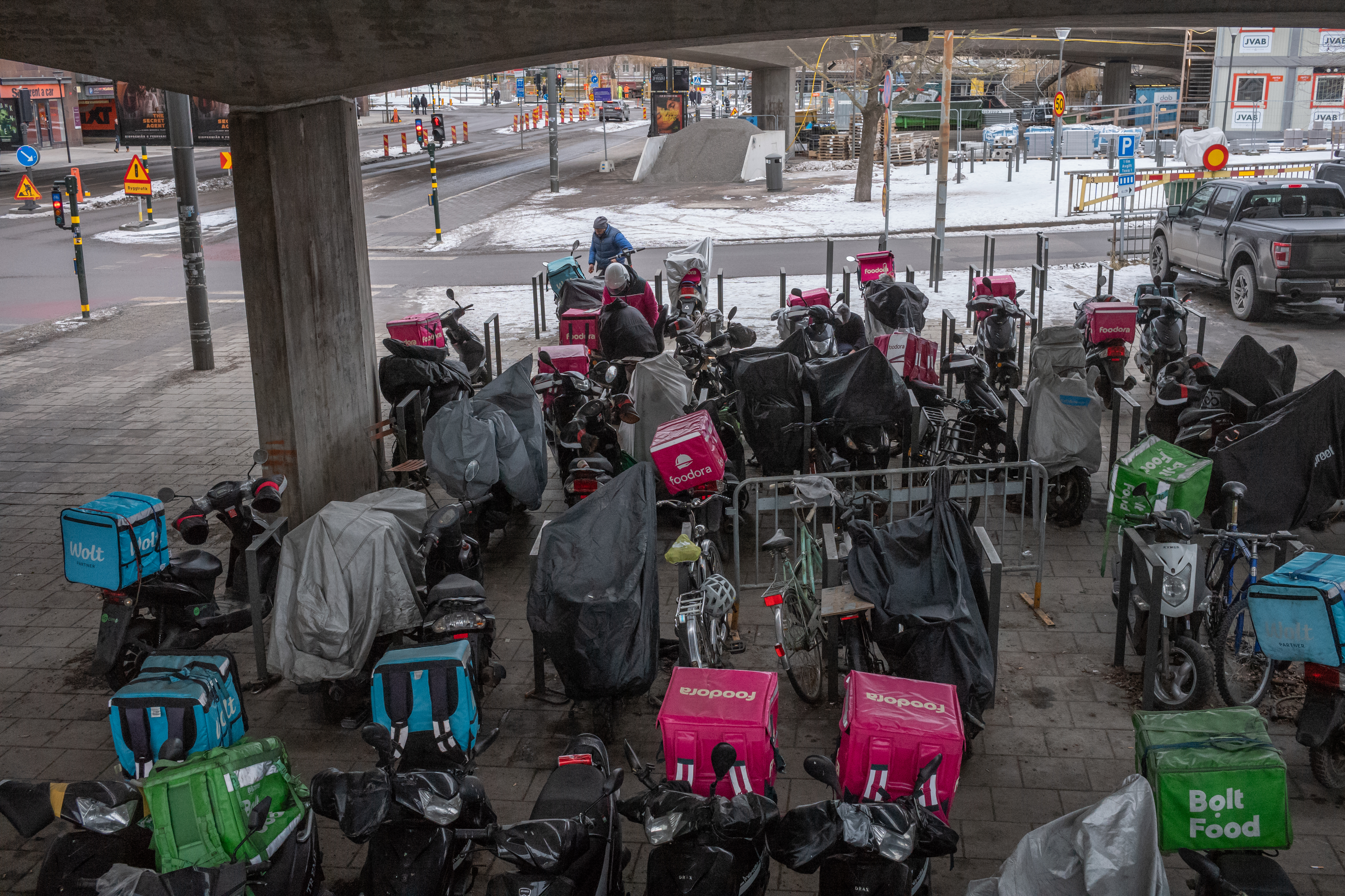 - sv Några matbud gör sig redo för ett kyligt arbetspass på sina mopeder.